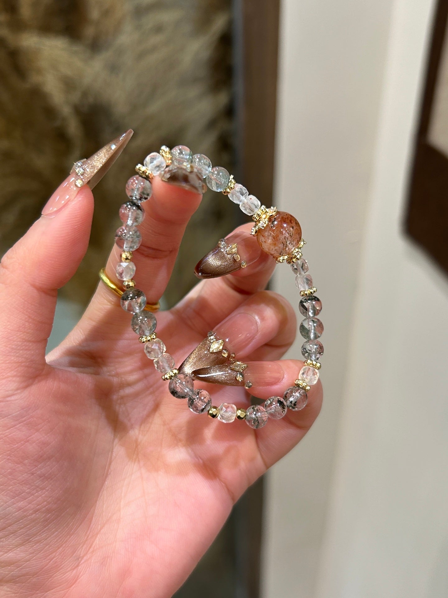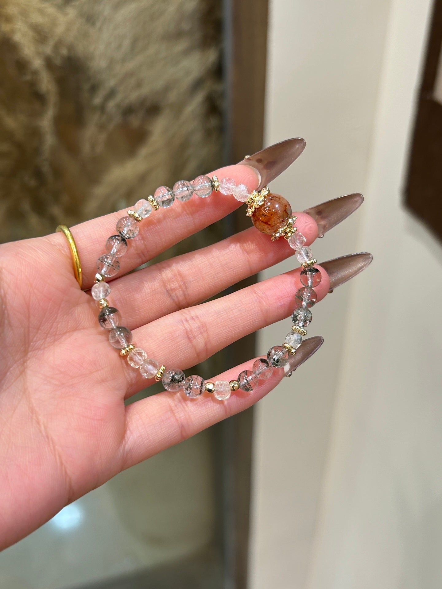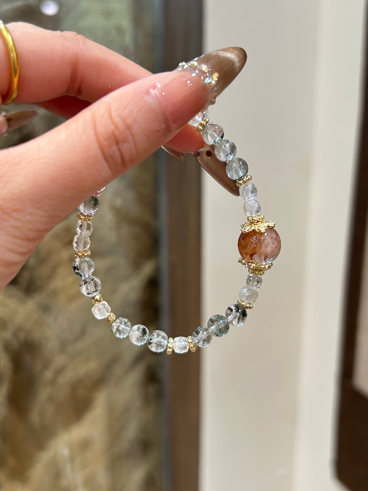 This elegant bracelet features Black Gold Rutilated Quartz and Green Phantom Quartz, two powerful crystals that offer protection, clarity, and emotional strength. Black Gold Rutilated Quartz helps to eliminate negative energy and promotes spiritual growth, while Green Phantom Quartz brings deep healing, enhances clarity, and fosters mental and emotional strength. The addition of gold accents adds a touch of luxury and sophistication to this meaningful piece.