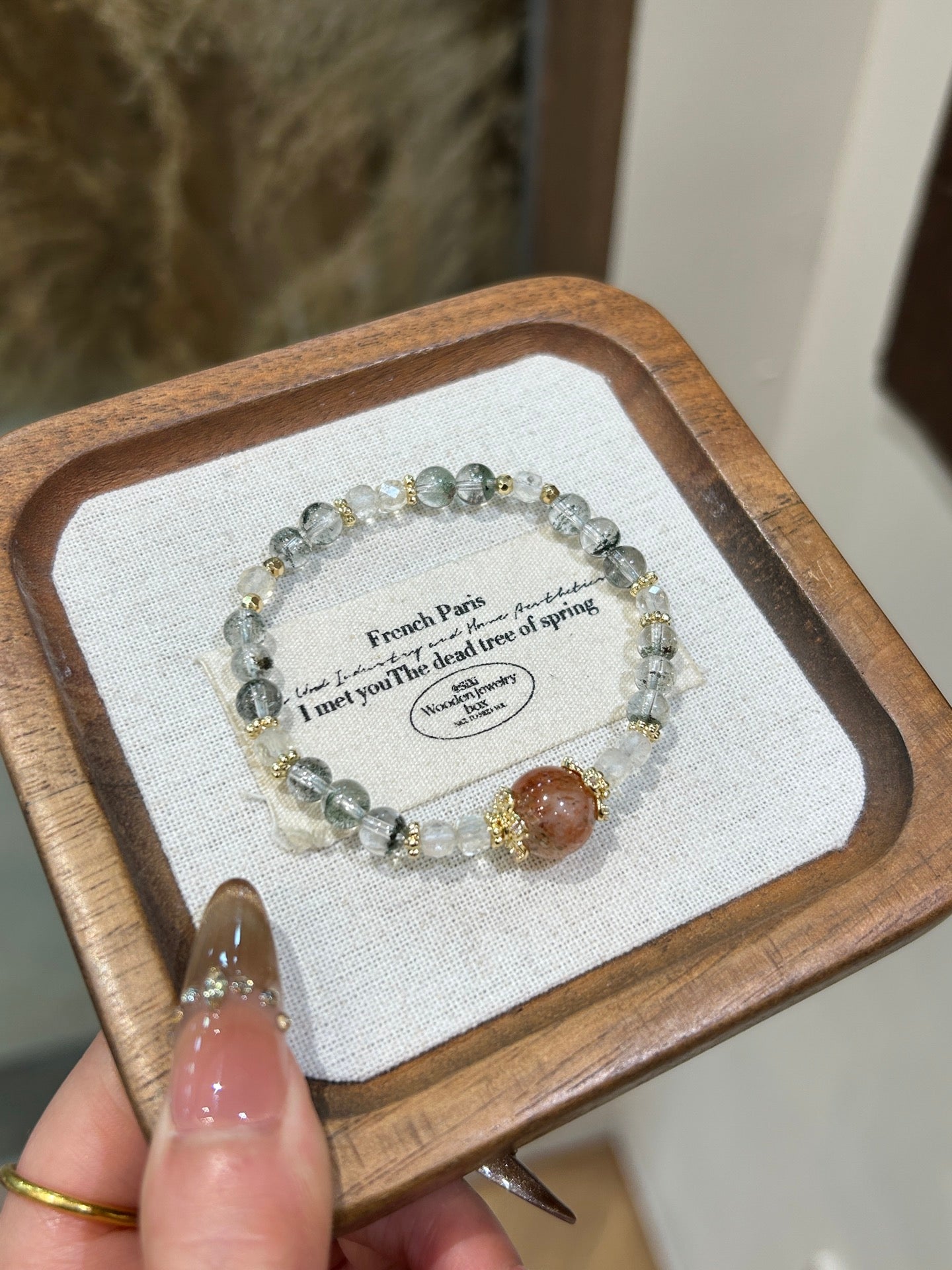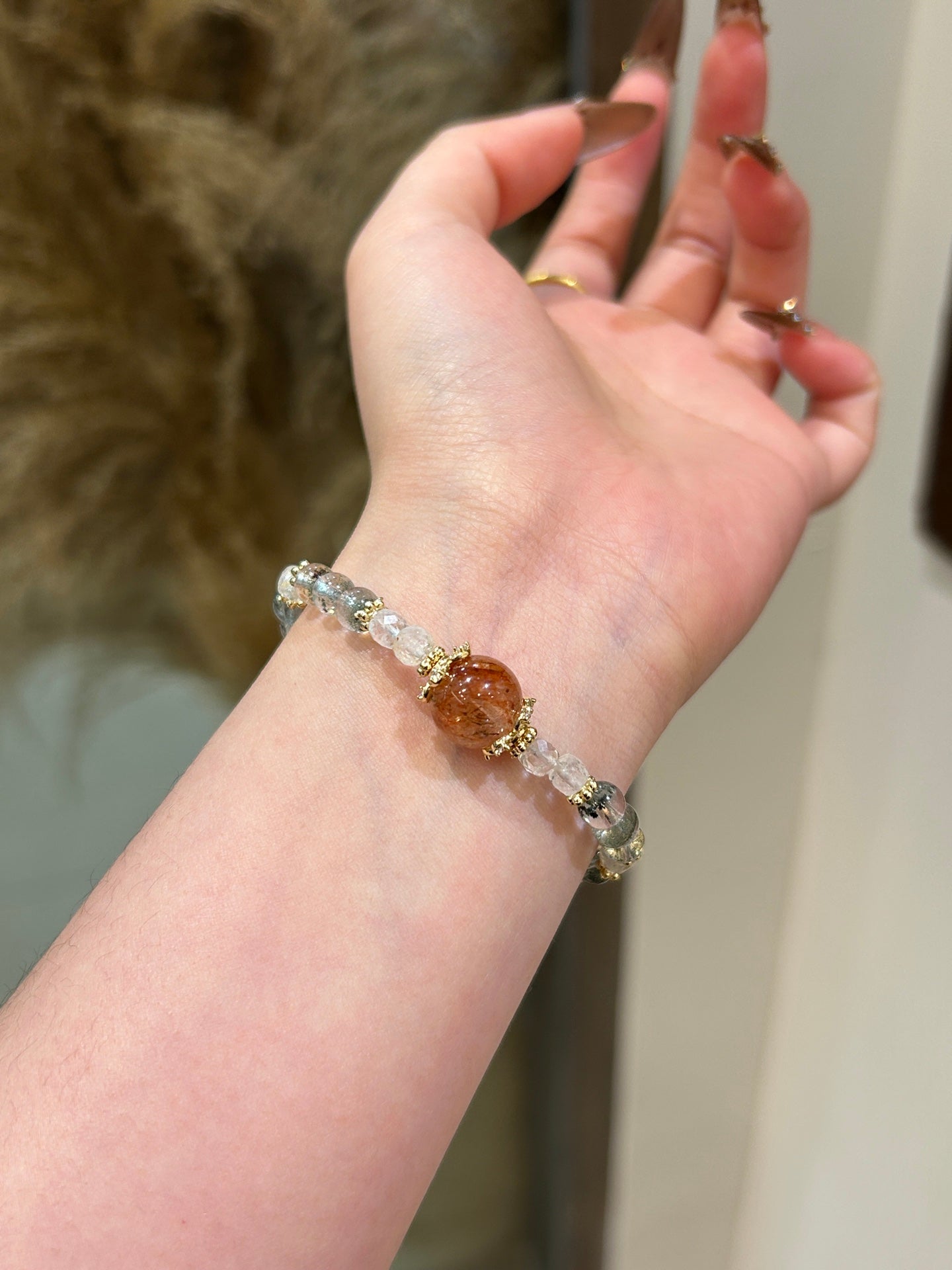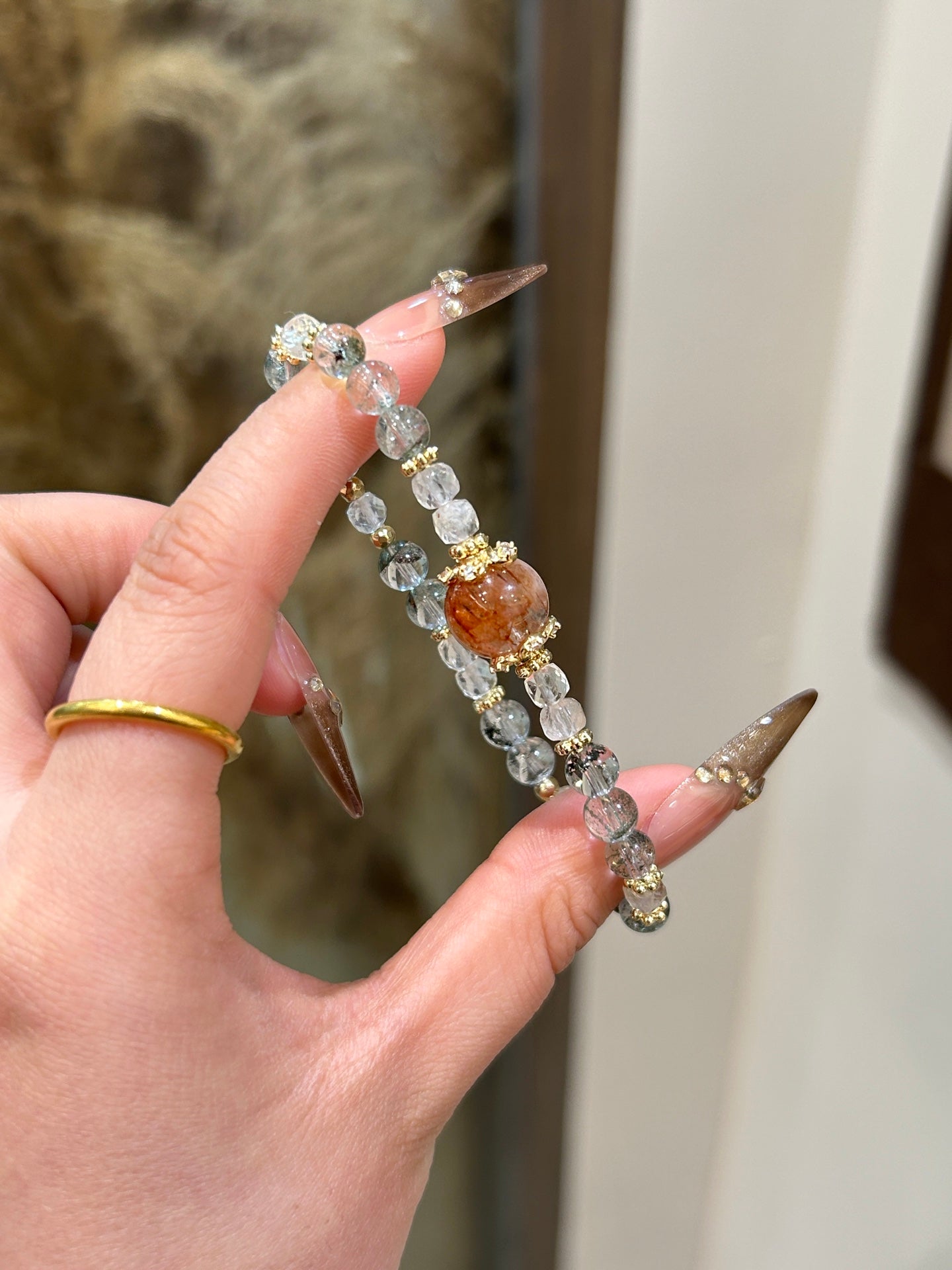 This elegant bracelet features Black Gold Rutilated Quartz and Green Phantom Quartz, two powerful crystals that offer protection, clarity, and emotional strength. Black Gold Rutilated Quartz helps to eliminate negative energy and promotes spiritual growth, while Green Phantom Quartz brings deep healing, enhances clarity, and fosters mental and emotional strength. The addition of gold accents adds a touch of luxury and sophistication to this meaningful piece.