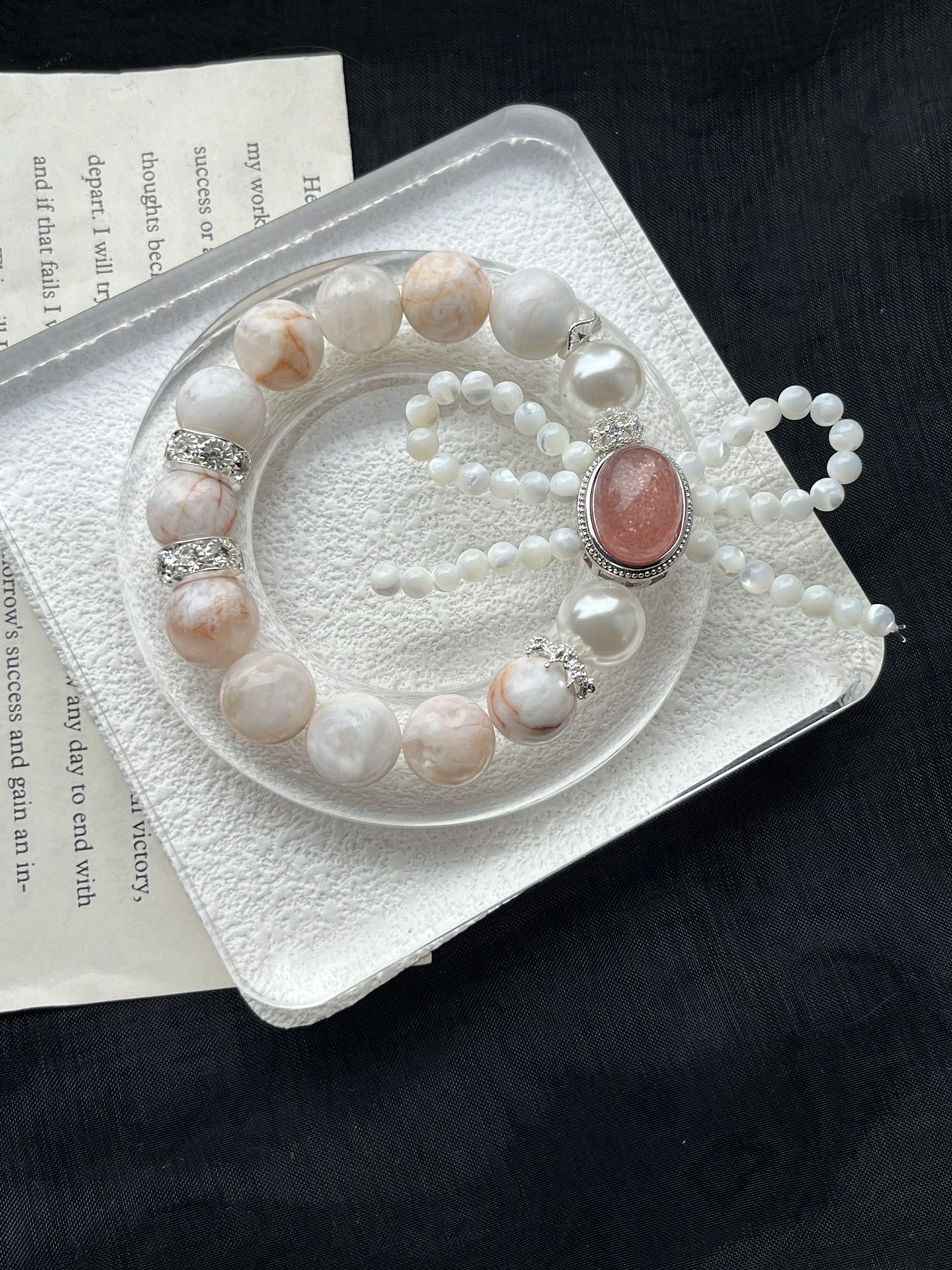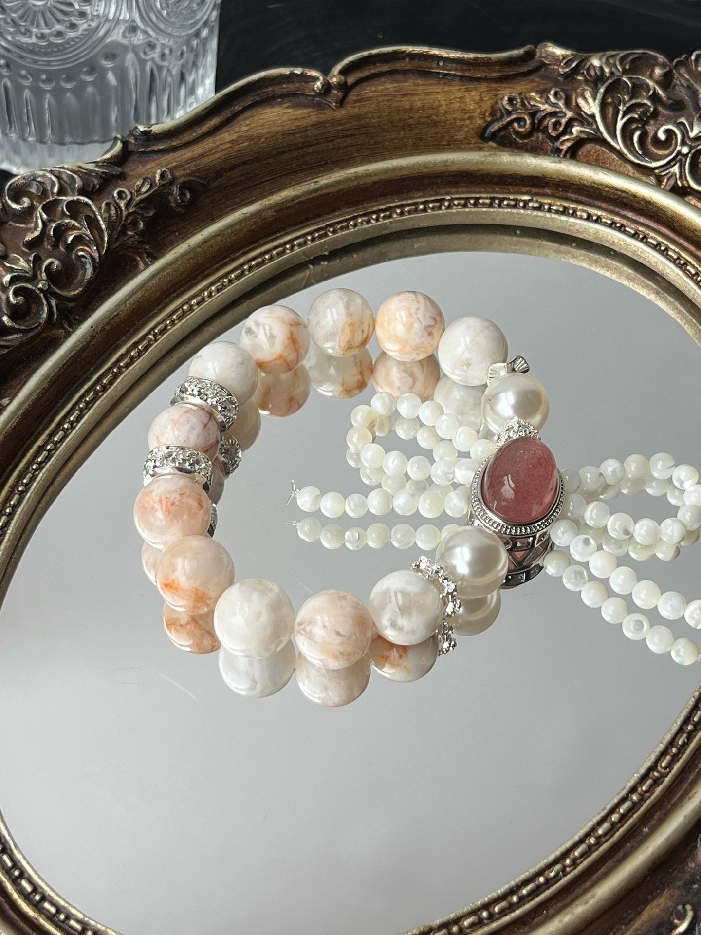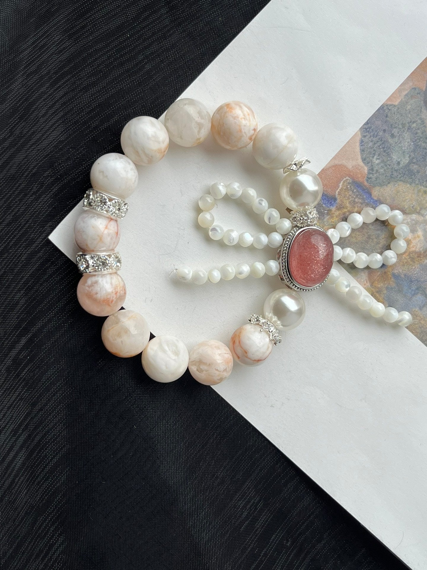 This elegant bracelet features natural pink crystal, pearls, and white agate beads, symbolizing love, harmony, and energy balance. Pink crystal aids in emotional healing, inner peace, and self-love, while pearls represent purity and elegance, promoting inner harmony. The white agate adds a warm touch, making this design both delicate and refined.