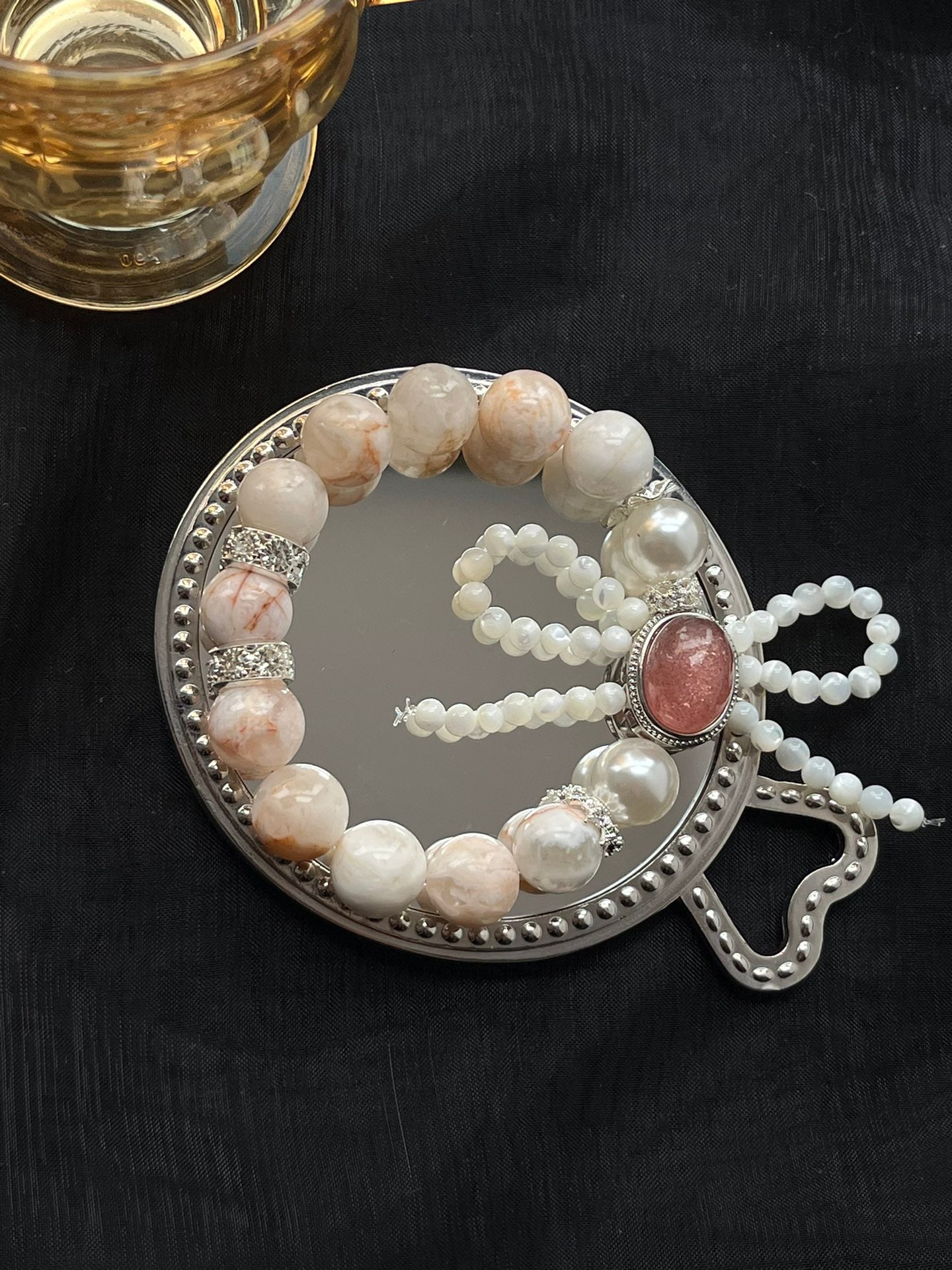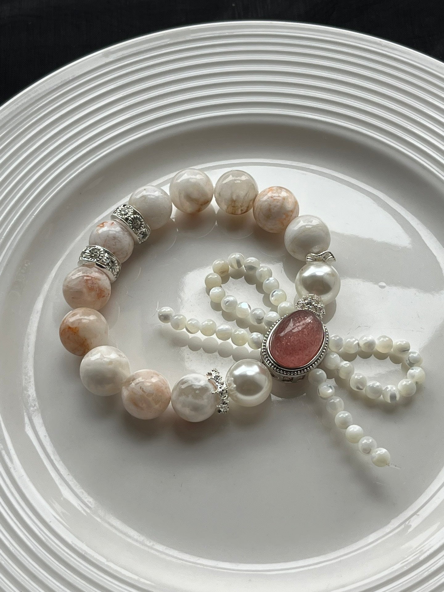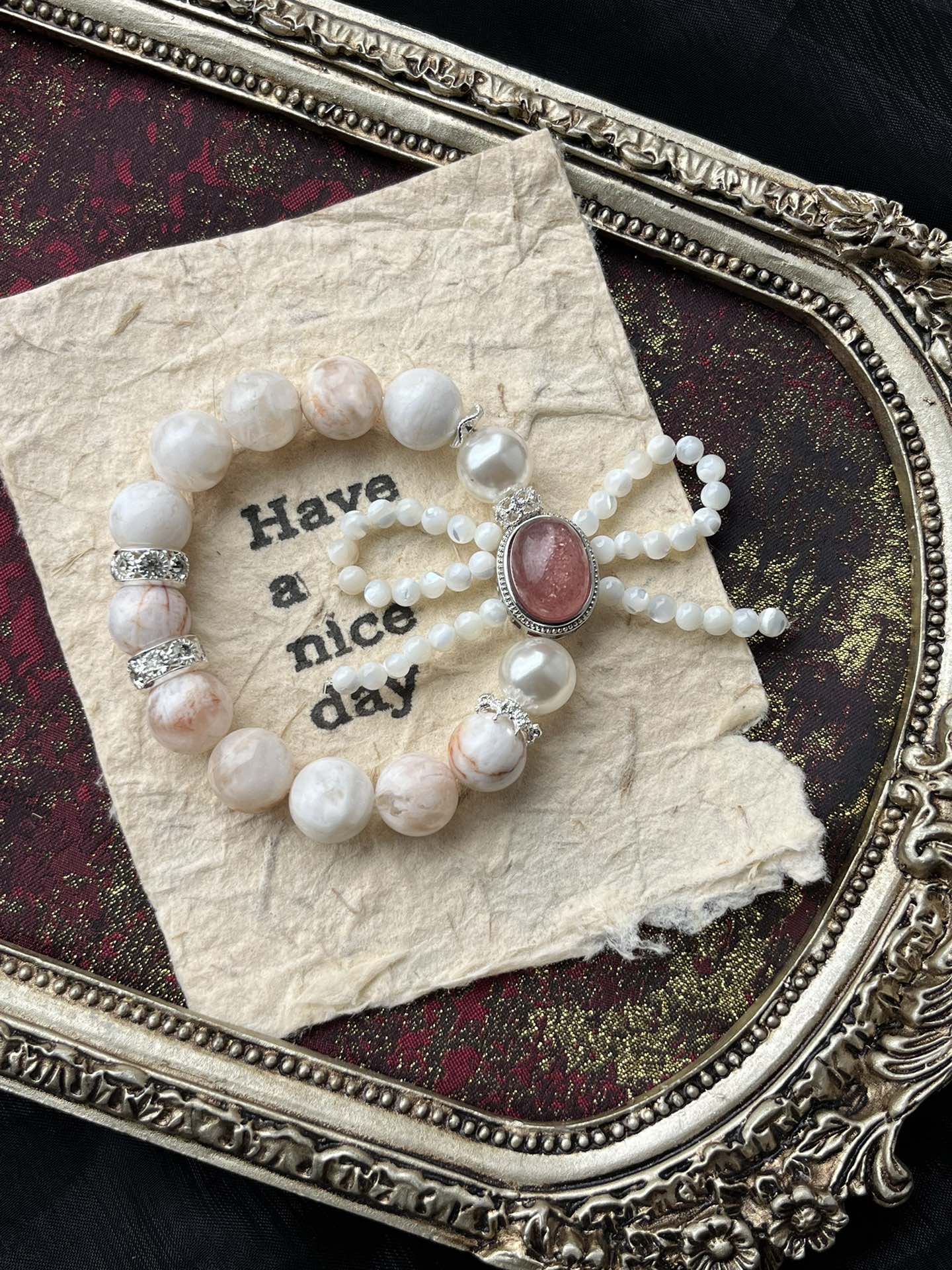This elegant bracelet features natural pink crystal, pearls, and white agate beads, symbolizing love, harmony, and energy balance. Pink crystal aids in emotional healing, inner peace, and self-love, while pearls represent purity and elegance, promoting inner harmony. The white agate adds a warm touch, making this design both delicate and refined.
