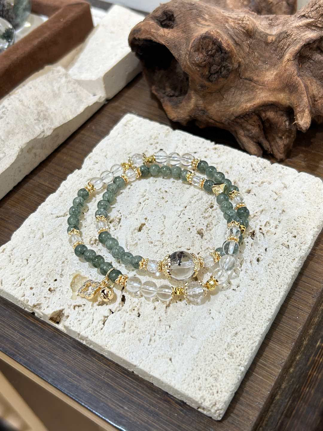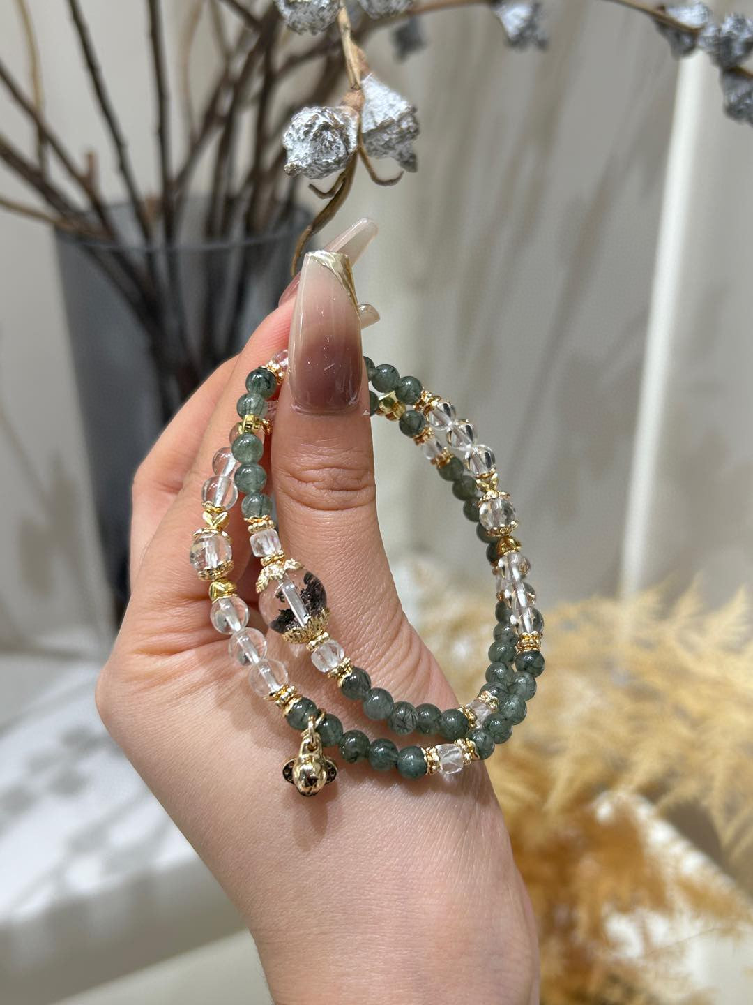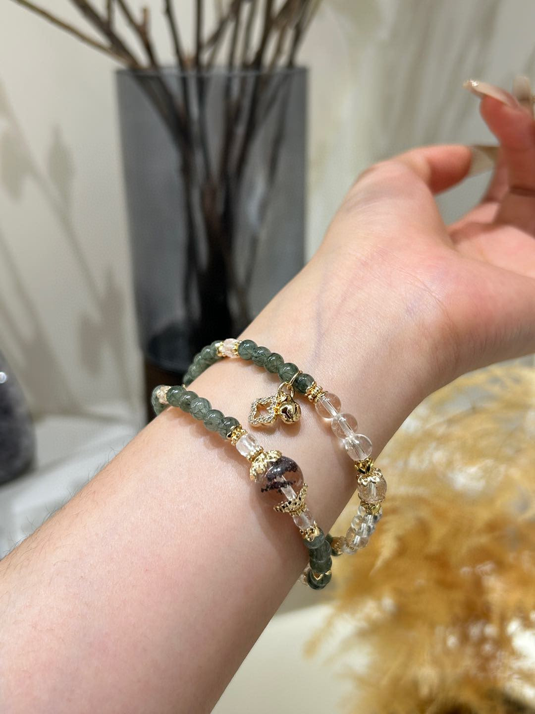 This bracelet features natural green agate and clear quartz beads, designed to bring energy balance, emotional healing, and spiritual enhancement to the wearer. Green agate is known for its calming properties, helping to balance emotions and relieve stress, while clear quartz purifies energy and enhances spirituality.
