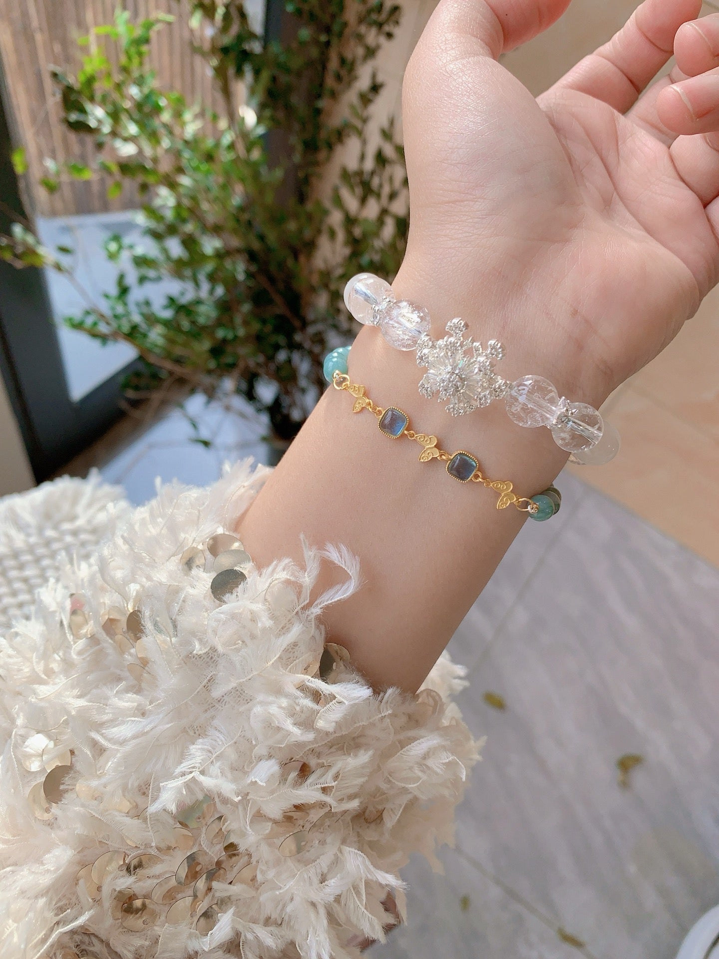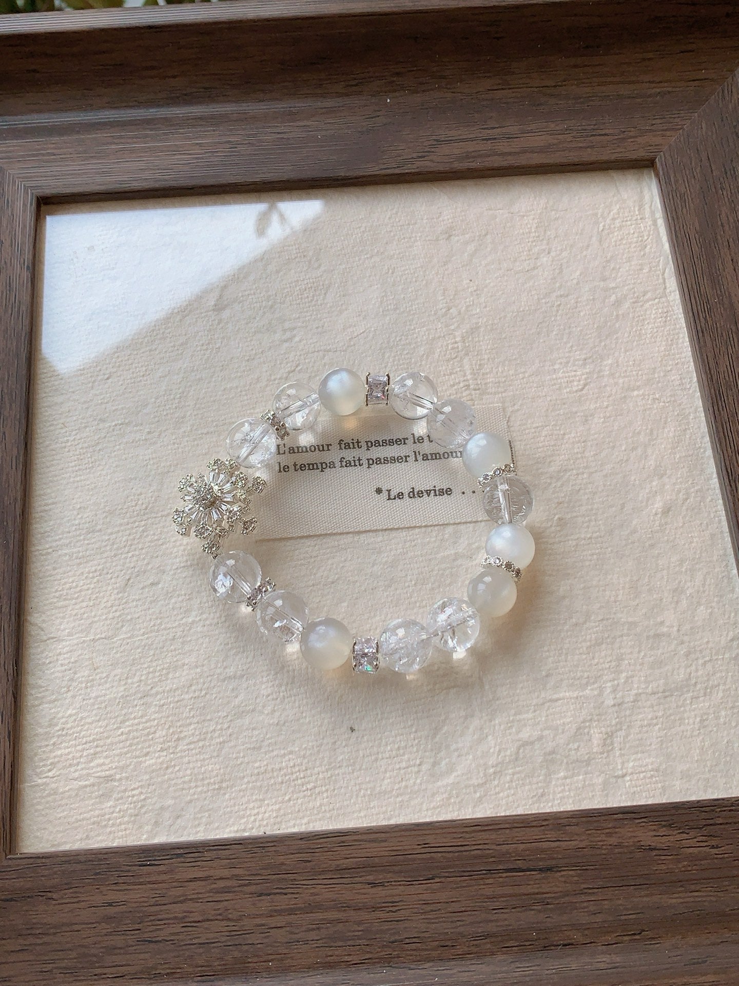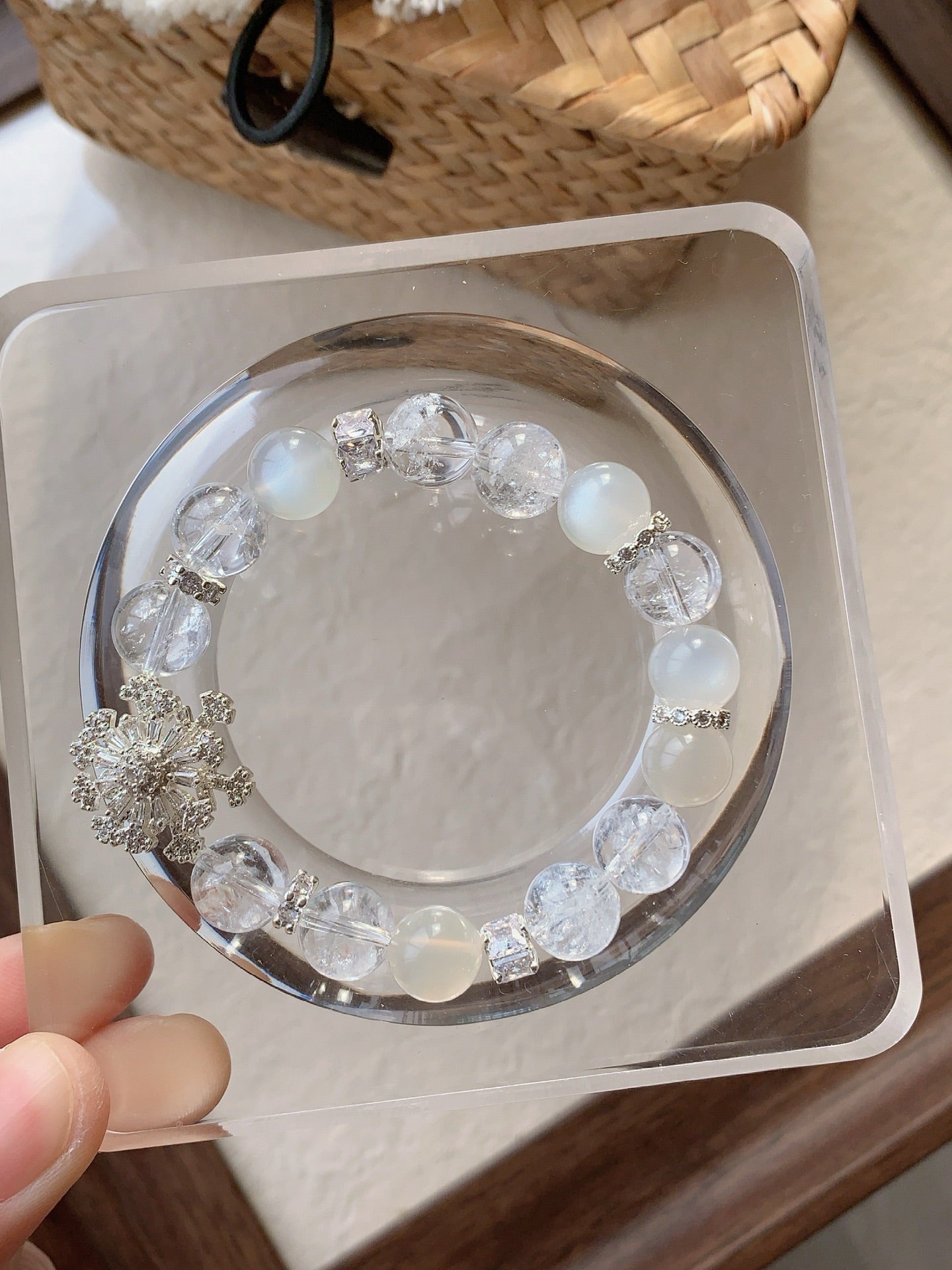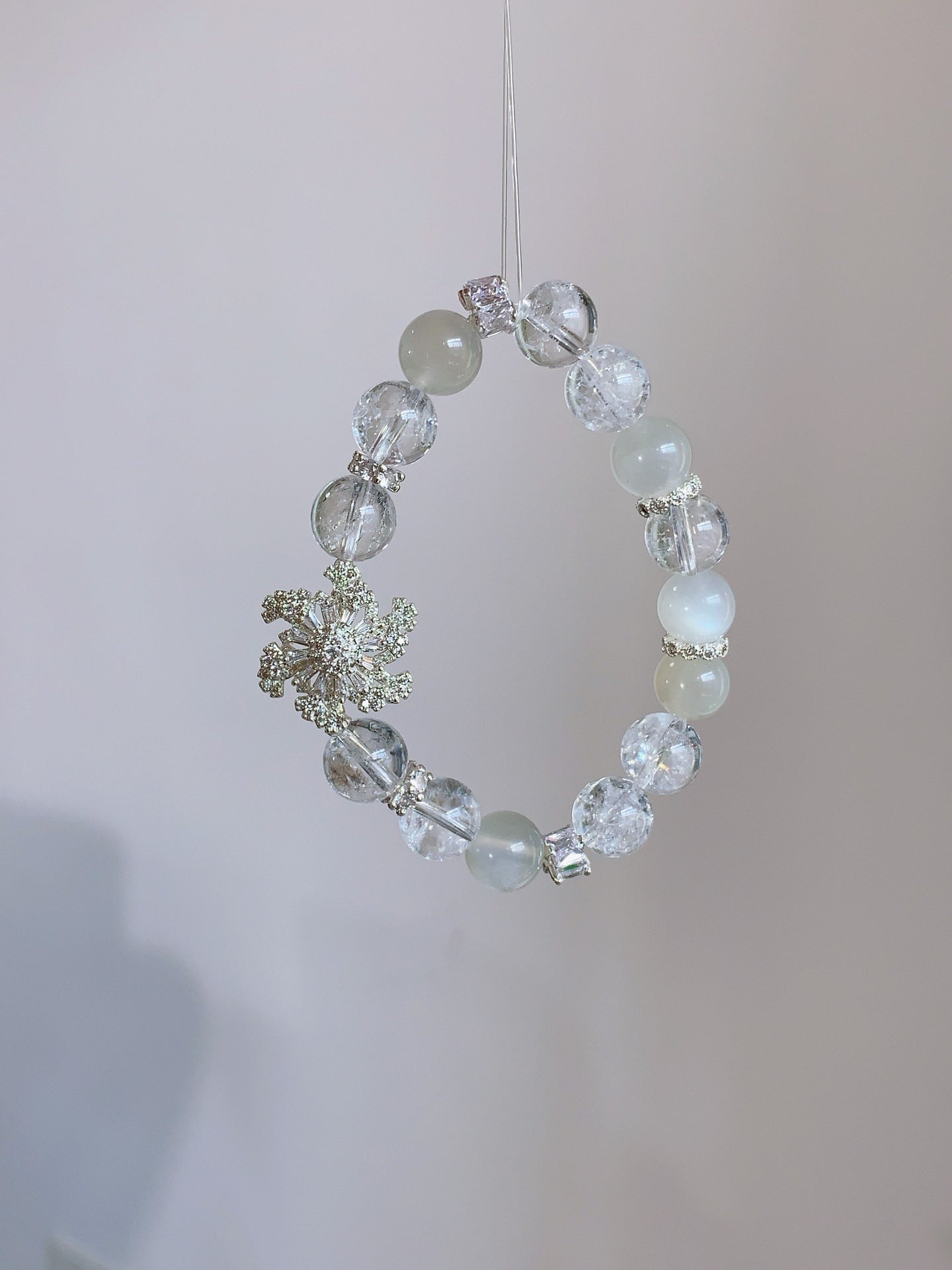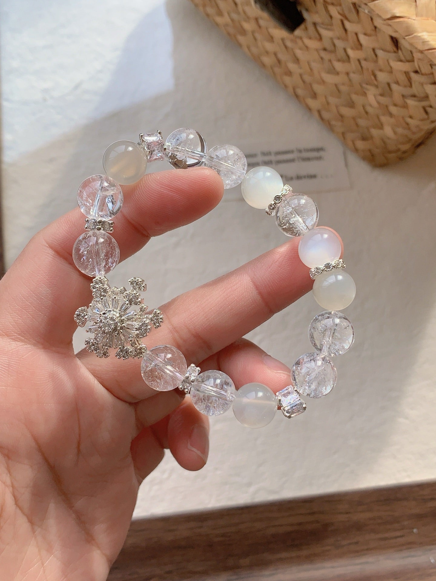 The bracelet is delicately adorned with a shimmering snowflake charm, symbolizing purity and elegance. Whether worn daily or on special occasions, this piece brings a timeless, ethereal touch to any outfit.