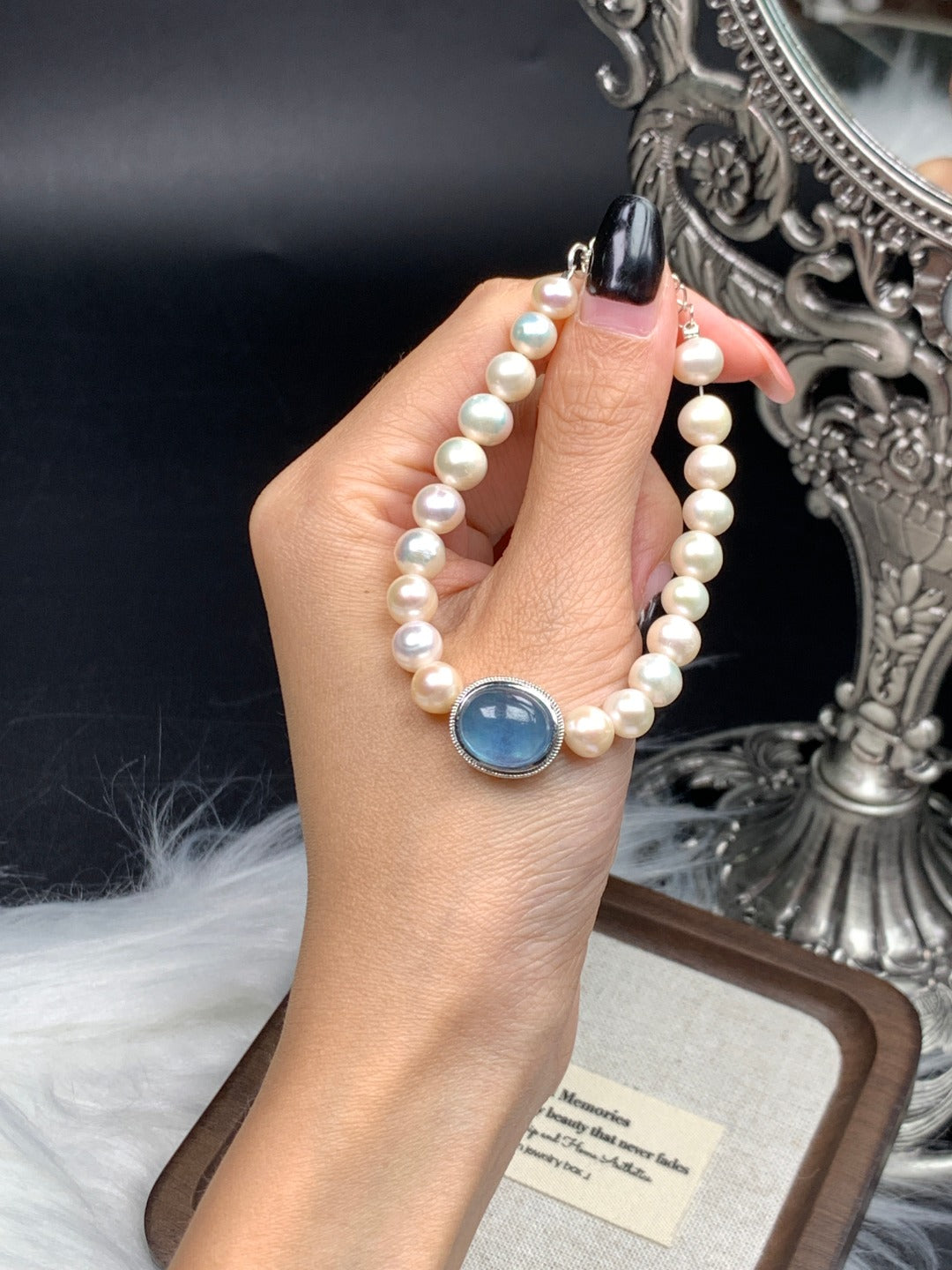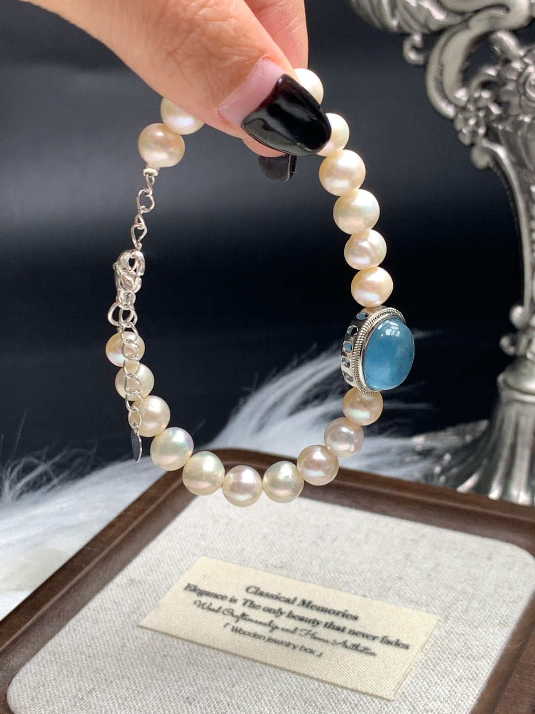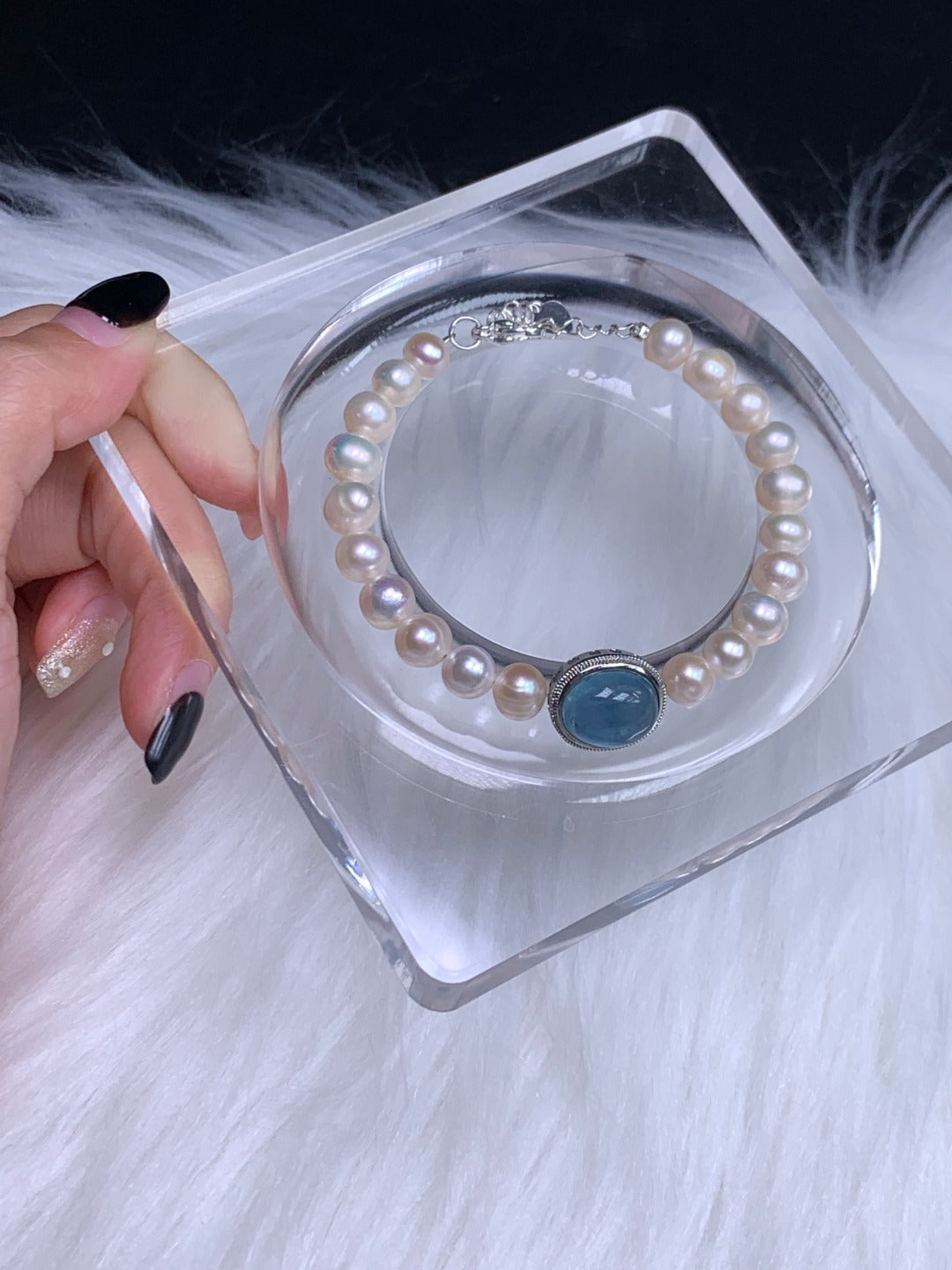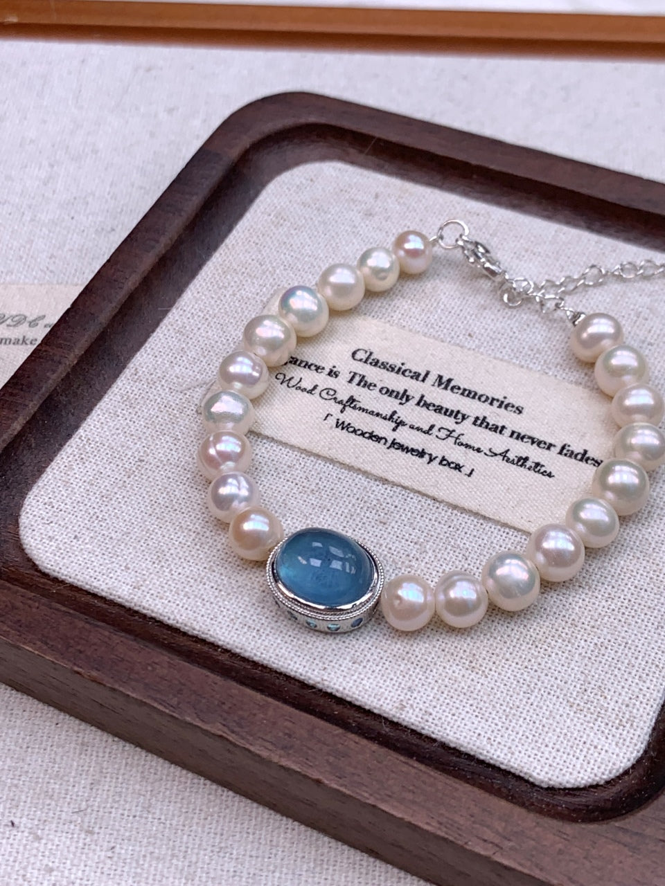This 'Ocean Pearl Bracelet' has a unique charm. The 8mm freshwater pearl exudes a soft and charming luster, like a quiet lake, symbolizing purity and tranquility, and can bring inner peace and elegance to the wearer. The deep blue of the aquamarine box seems to be the epitome of the mysterious ocean, symbolizing courage and vastness, helping you to move forward bravely in life and open up new worlds. The combination of the two is unique and wonderful. It is the perfect fusion of fashion and metaphysical charm, adding mysterious and charming brilliance to you.