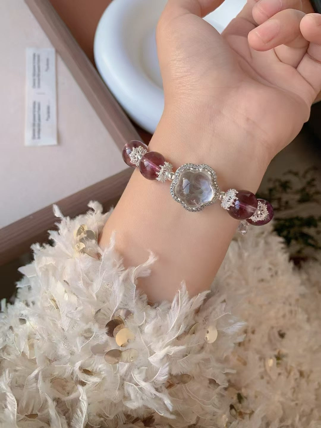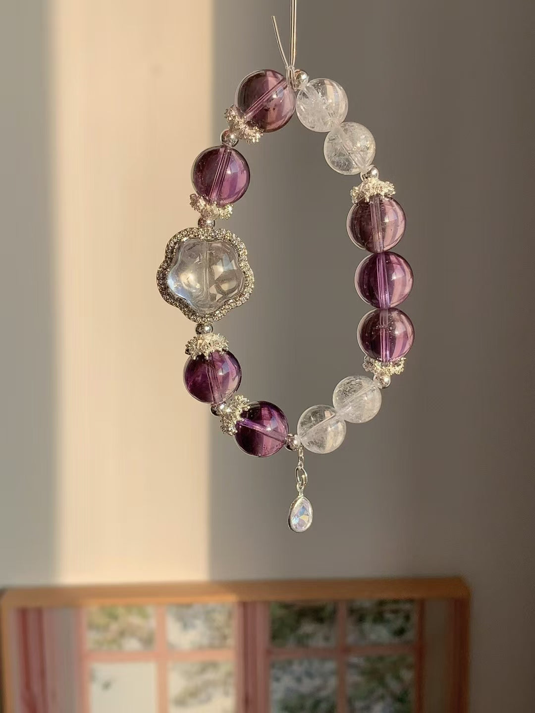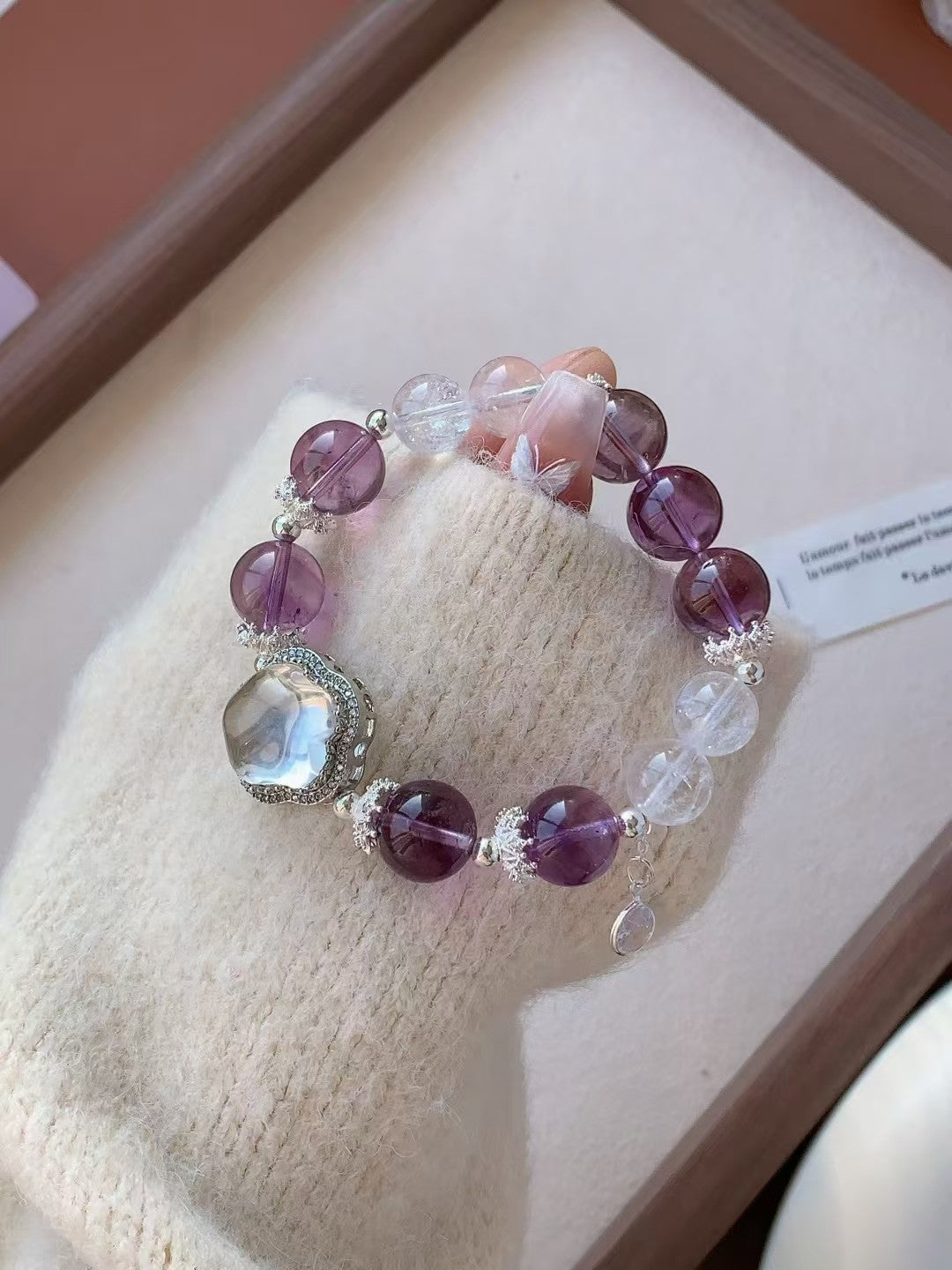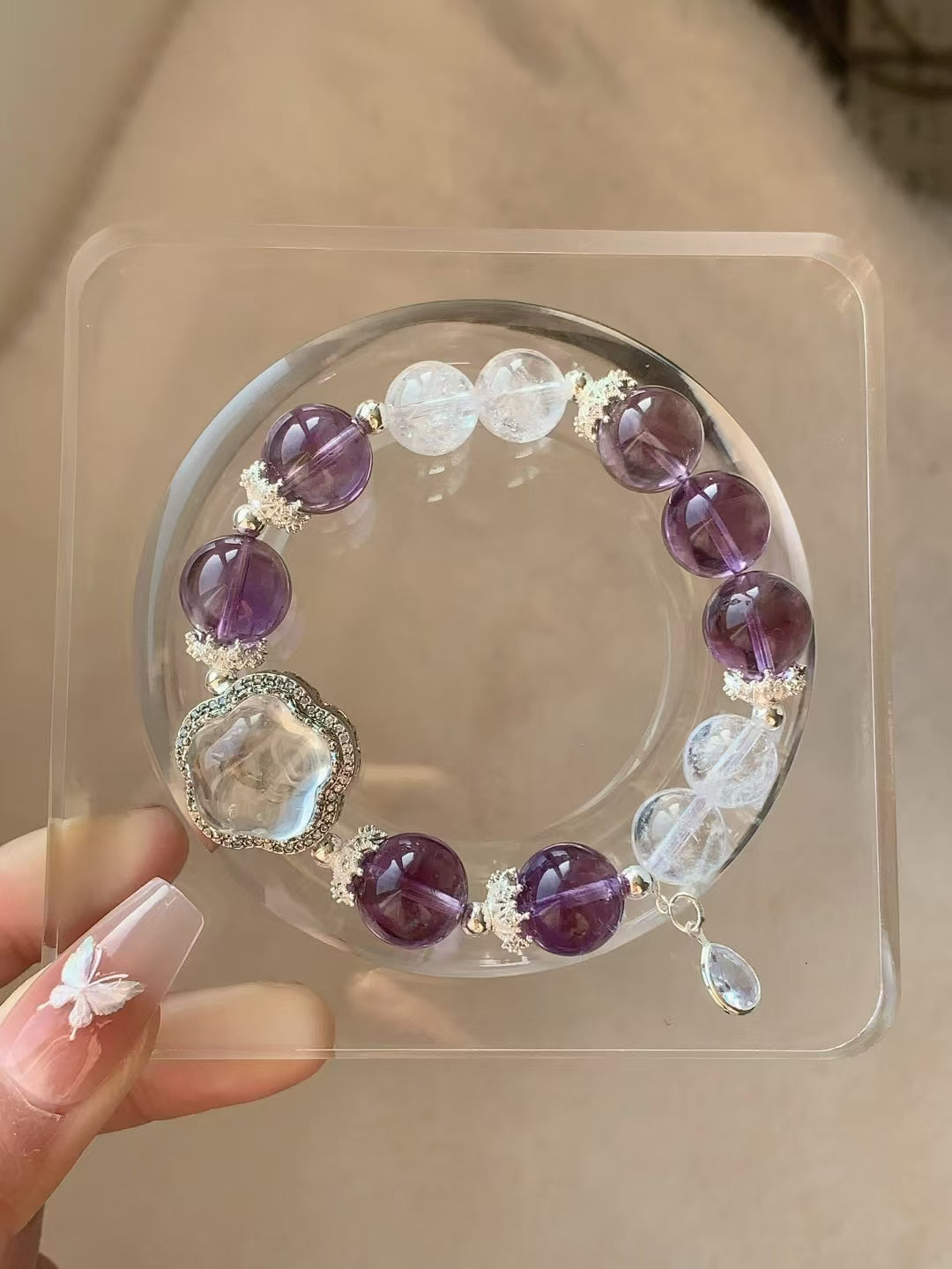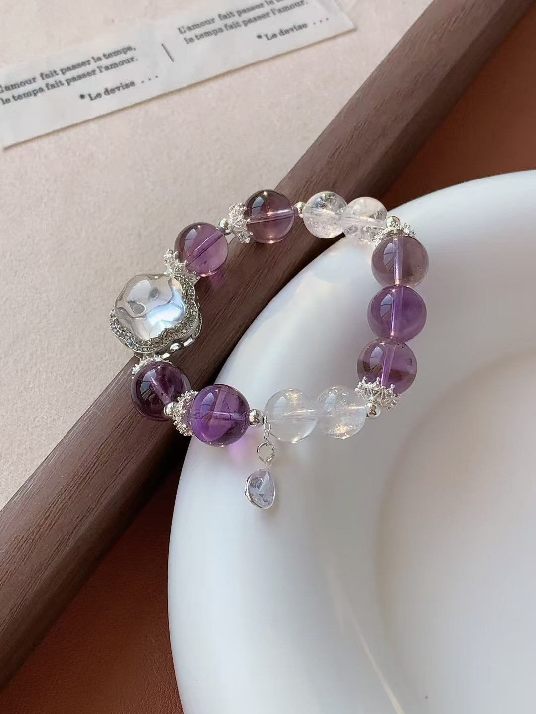 This exquisite bracelet features natural amethyst and clear quartz beads, complemented by elegant silver accents. Amethyst is known as a symbol of spiritual growth and inner peace, helping to relieve stress and promote emotional healing. Clear quartz has powerful energy-clearing properties, enhancing intuition and mental clarity.