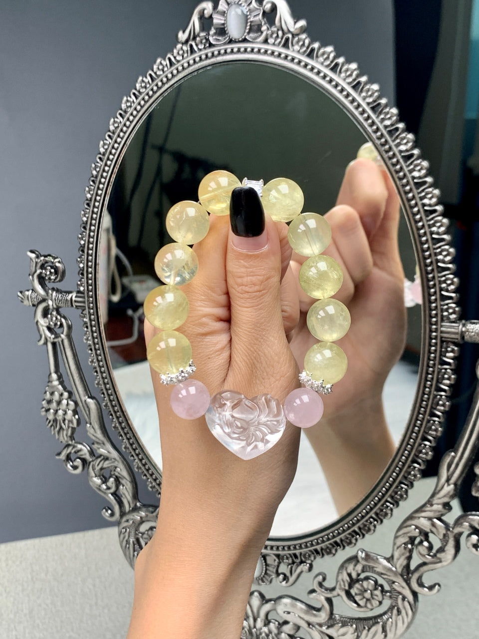 "Sweet Dream Bracelet", the 13mm bead size is unique. Lemon yellow acer is as bright and warm as the sun, bringing positive energy and vitality. Pink crystal exudes gentle pink light, which is a symbol of love and beauty, and can add romance and affinity to you. The white crystal love fox is exquisite and cute. The white crystal means purity and protection, while the love fox adds a sense of playfulness and agility, as if guarding your love and dreams. Their combination is like a sweet dream. When you wear it abroad, it can make you feel full of happiness and beauty, showing charming charm and confident style.