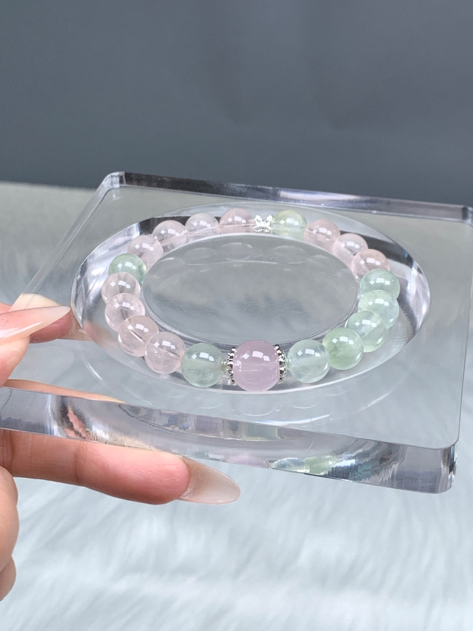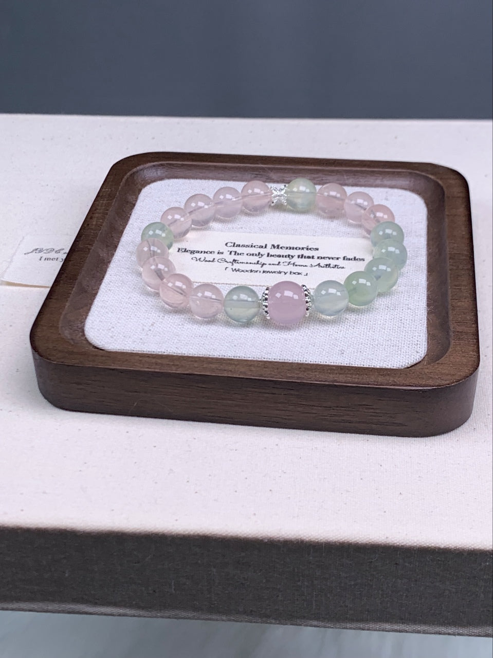 Pink quartz is soft and tender, a symbol of love and interpersonal relationships. In metaphysics, it can attract you to peach blossoms and bring a sweet emotional atmosphere. Prehnite is fresh, green and full of vitality. It is believed to have the power to gather wealth and bring good luck. When they are combined together, this bracelet will become a blessing device for your charm whether in domestic or foreign markets, making you full of luck and beauty in love and life, and blooming with unique brilliance.
