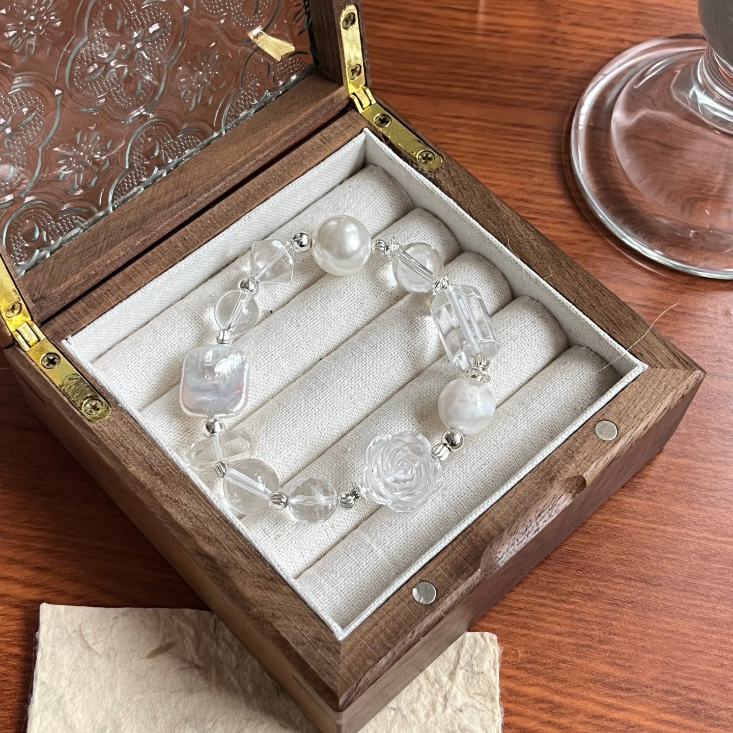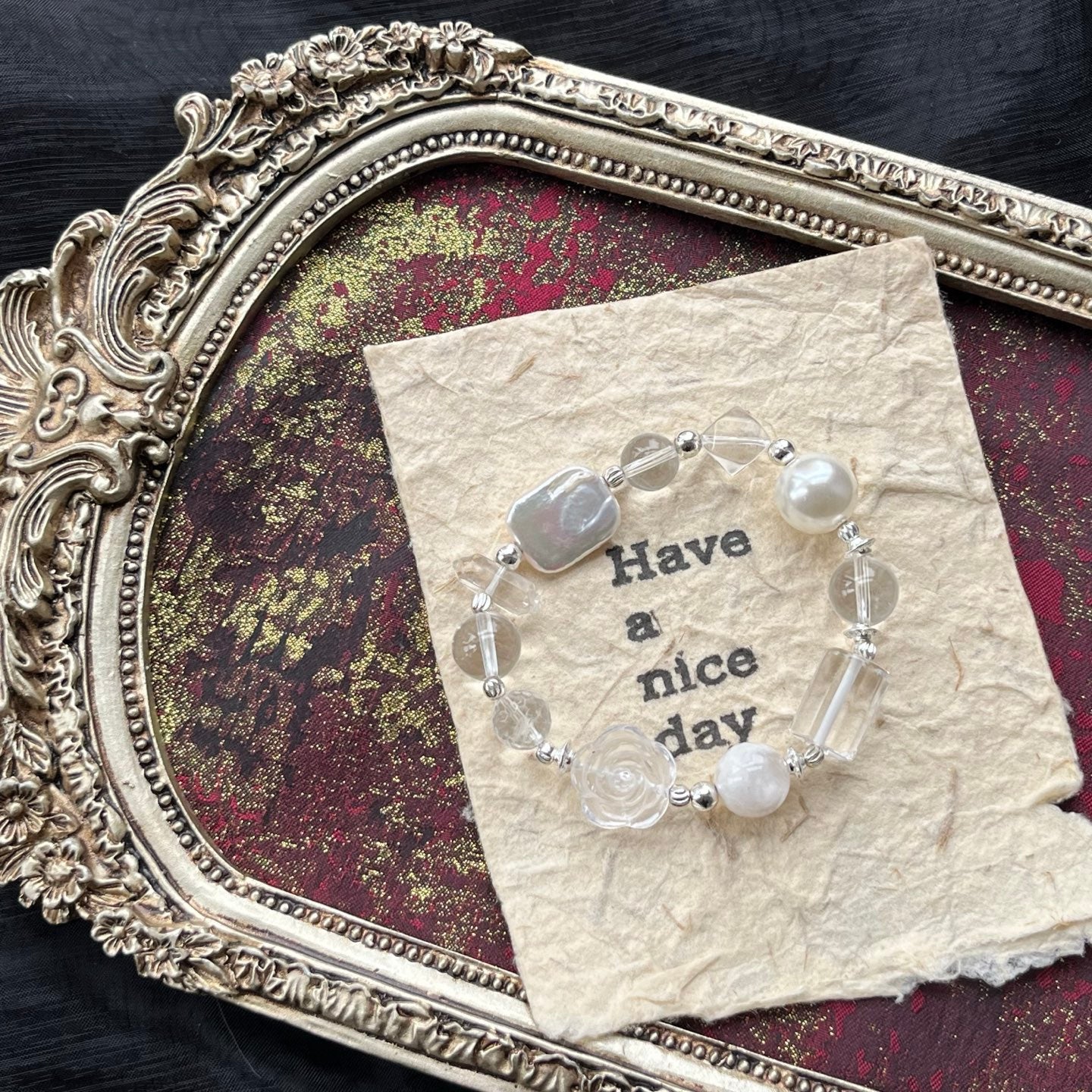 This elegant bracelet features a combination of clear crystal beads, pearl accents, and silver details, creating a sophisticated and timeless look. The transparent crystals add a touch of purity and clarity, while the large pearls provide an elegant and luxurious feel. The rose-shaped crystal adds a unique, feminine touch to the design, making it a perfect accessory for any occasion.